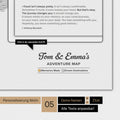 Maak van de wereldkaart een uniek exemplaar – met een personalisatie. Kies tussen het Bourdain-citaat of geef ons je gewenste citaat door, dat we linksonder op de kaart drukken. Voor maximale persoonlijkheid kun je rechtsonder tot vier motieven kiezen om je namen op de kaart te zetten. Voor bedrijven bieden we bovendien de mogelijkheid om tegen een kleine meerprijs hun logo te drukken.