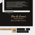 Maak van de wereldkaart een uniek exemplaar – met een personalisatie. Kies tussen het Bourdain-citaat of geef ons je gewenste citaat door, dat we linksonder op de kaart drukken. Voor maximale persoonlijkheid kun je rechtsonder tot vier motieven kiezen om je namen op de kaart te zetten. Voor bedrijven bieden we bovendien de mogelijkheid om tegen een kleine meerprijs hun logo te drukken.