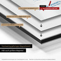 Longevity is guaranteed here: Our magnetic board is made of 3 mm thick aluminum Dibond – a material that cannot be bent with muscle power alone. We laminate this board with a magnetic 0.75 mm ferro film and seal the surface with a matt UV protection. Travel and kitchen magnets adhere to it without any problems, and photos can also be attached using magnets.