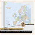 Make the Europe map unique – with a personalization. Choose between four designs to place your names on the map and, depending on the design, to include a legend. We also offer companies the option to print their logo for a small additional fee.
