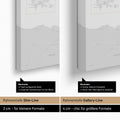 Slim-Line (2 cm) offers a flat look with subtle shadows. Gallery-Line (4 cm), on the other hand, provides a high-quality gallery look with strong shadows. In addition, the 4 cm frame gives extra stability, which is particularly recommended for larger push pin canvases from 160 cm.