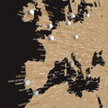 Detailansicht einer schwarz-weißen Weltkarte von Breuers, in der goldene Pins gesteckt sind und bereits besuchte Reiseziele markieren