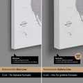 Vergleich der Rahmentiefe unser Weltkarten Pinn-Leinwand, zwischen Slim-Line mit 2 cm Tiefe und Gallery-Line mit 4 cm Tiefe