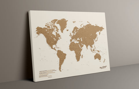 Our push pin canvases are made from a 360 gsm thick cotton blend fabric, which is printed with a high resolution of 2,400 dpi. Carefully created vector files of our world maps form the optimal starting material for this. This ensures that every location on the map is really easy to read - and that every pin can be put exactly where it belongs.